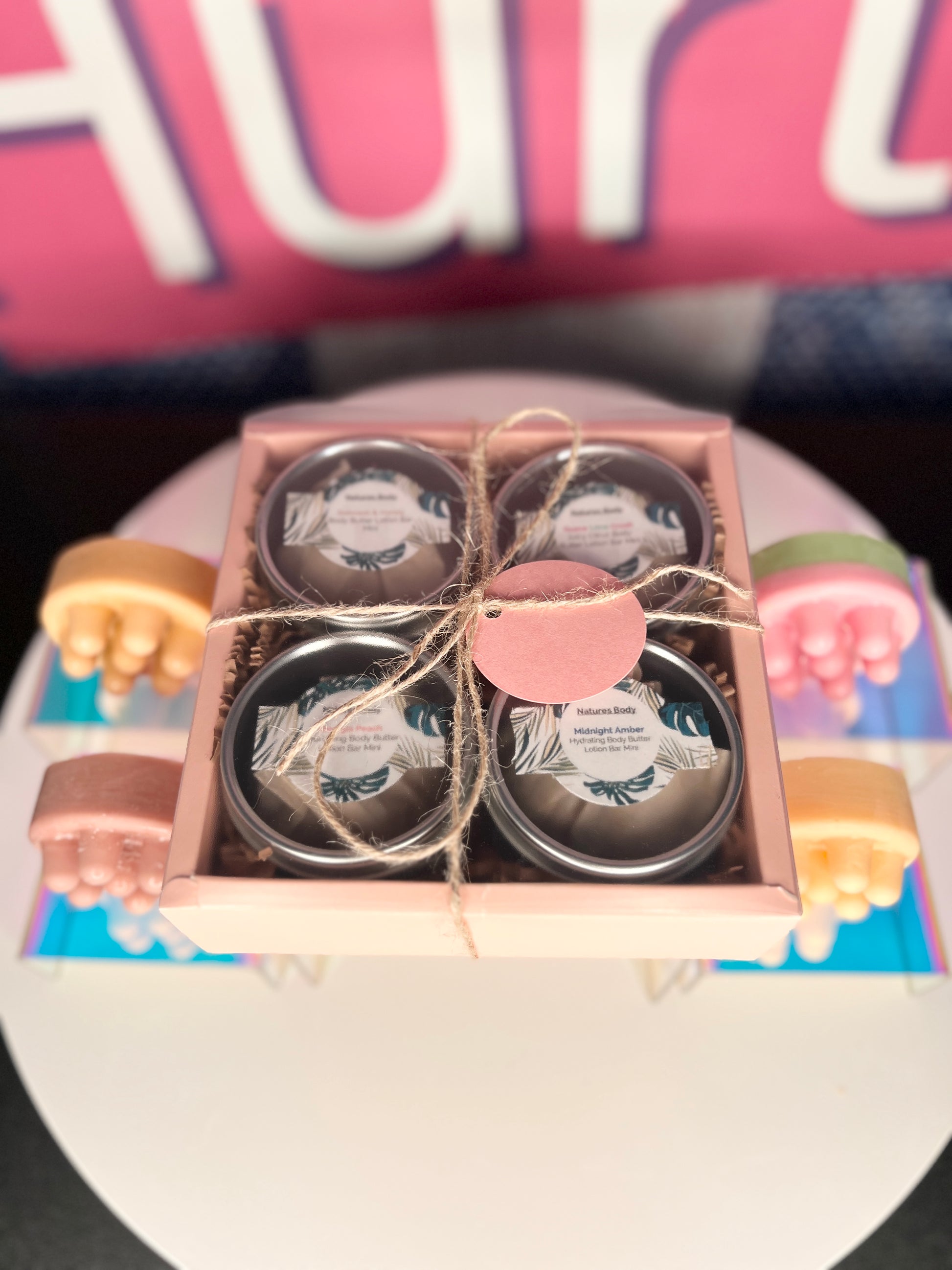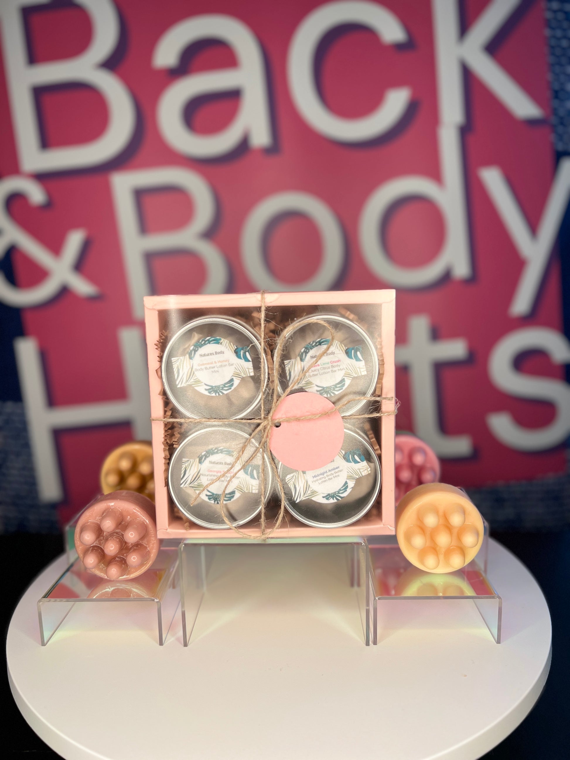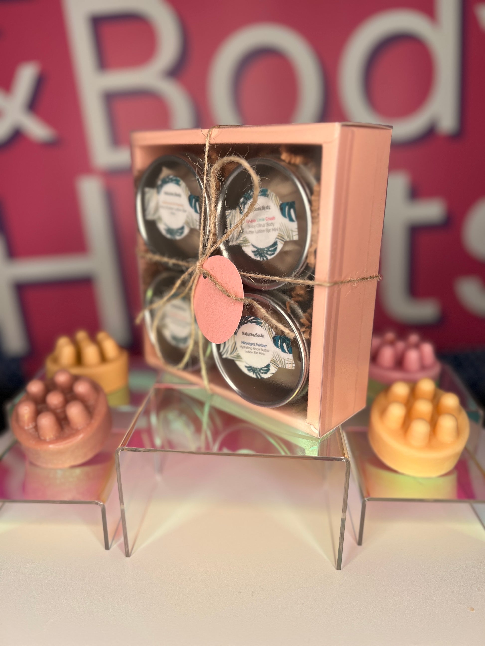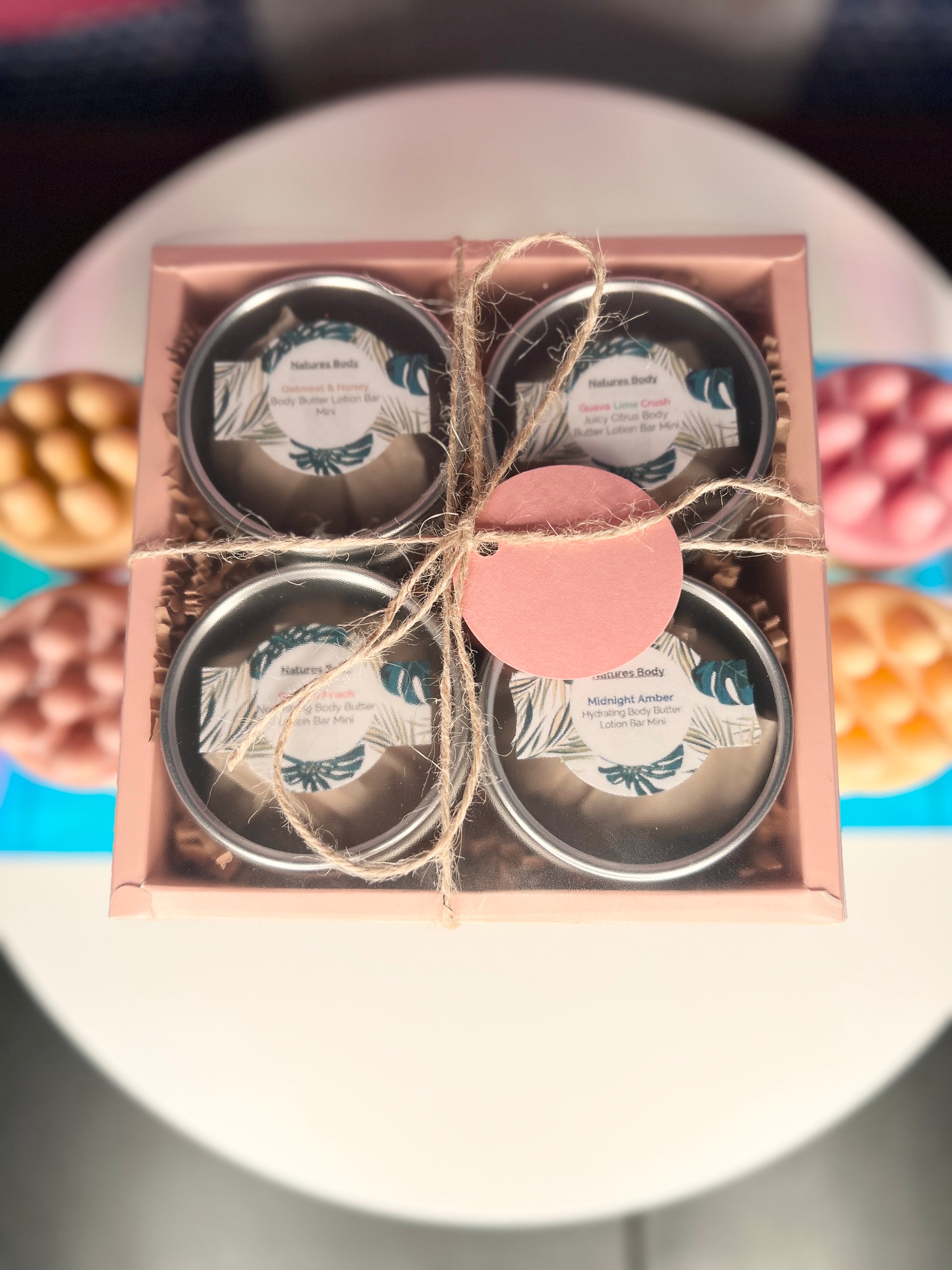 Indulge in silky smooth skin & try 4 different scents with our Body Butter Lotion Bar Mini Sample Set! Made with nourishing ingredients, these mini bars provide long-lasting moisture without the greasy feel of traditional lotions. Experience the benefits of our body butter in a convenient, travel-friendly size.